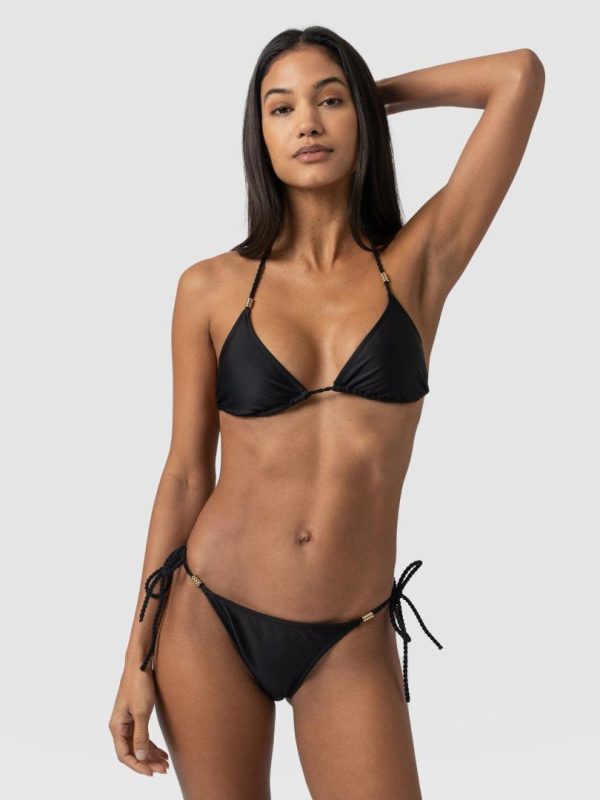 Make: Triangle bikini top. Slim fitting. Fully lined. Removable cups. Gold bead details on ties.