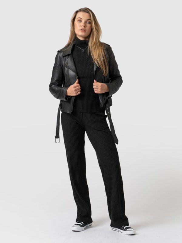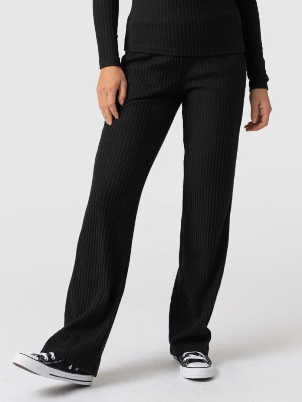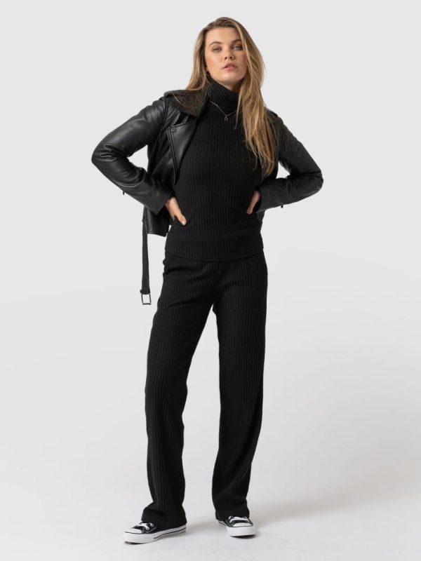 Our best selling straight leg pant in soft black rib. A perfect easy straight leg pant with a pull on easy construction and pockets. A beautiful easy pant with an interesting texture. Effortlessly pair them with the matching Rib Tempest Roll Neck for a coordinated look for comfort. Dress them up with a leather jacket and boots for a timeless evening look.