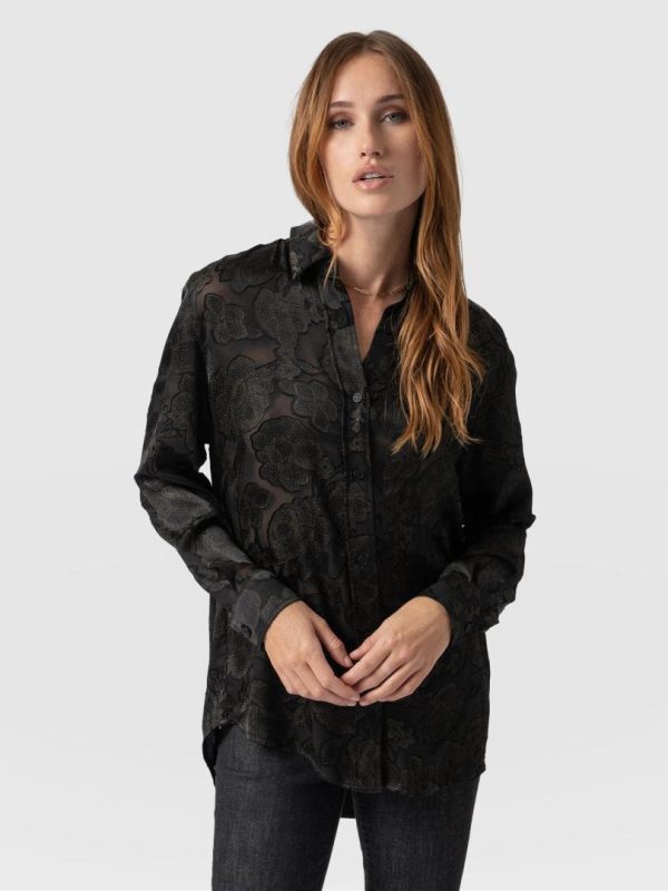 Saint And Sofia Boyfriend Shirt Black & Gold Floral Burnout | Women Blouses & Shirts
