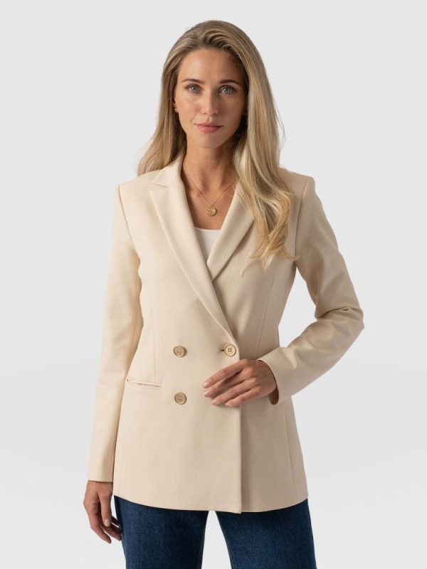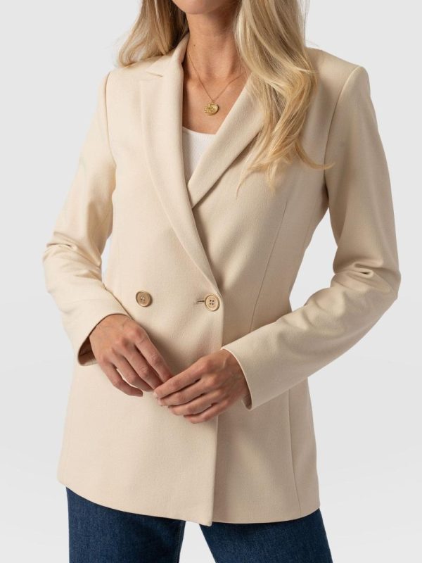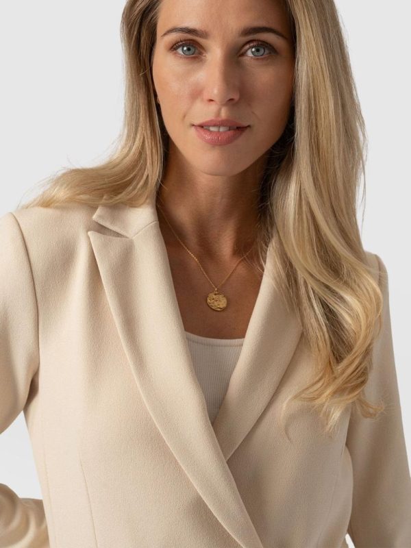 Elevate your wardrobe with the Cambridge Blazer in beige, a beautifully tailored double-breasted jacket set to become one of your wardrobe essentials. This blazer features lightly padded shoulders and brushed-gold buttons, adding sophistication to any look. Wear it with the matching Cambridge Wide Leg Pants for a coordinated aesthetic or as a stand-alone piece with sneakers and jeans for a more casual vibe.
