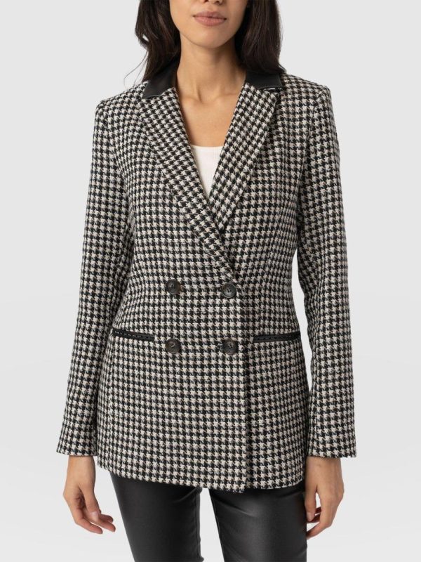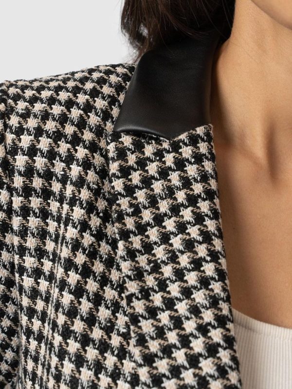 The Carmen Blazer is a double-breasted jacket masterfully handmade from a luxurious cotton blend by our team of artisans in Europe. It’s topped by notched lapels and features a leather collar for an urban twist on the classically tailored design. The houndstooth print is perfect for creating relaxed yet sophisticated looks when worn over your favourite pair of jeans and a white T-shirt.