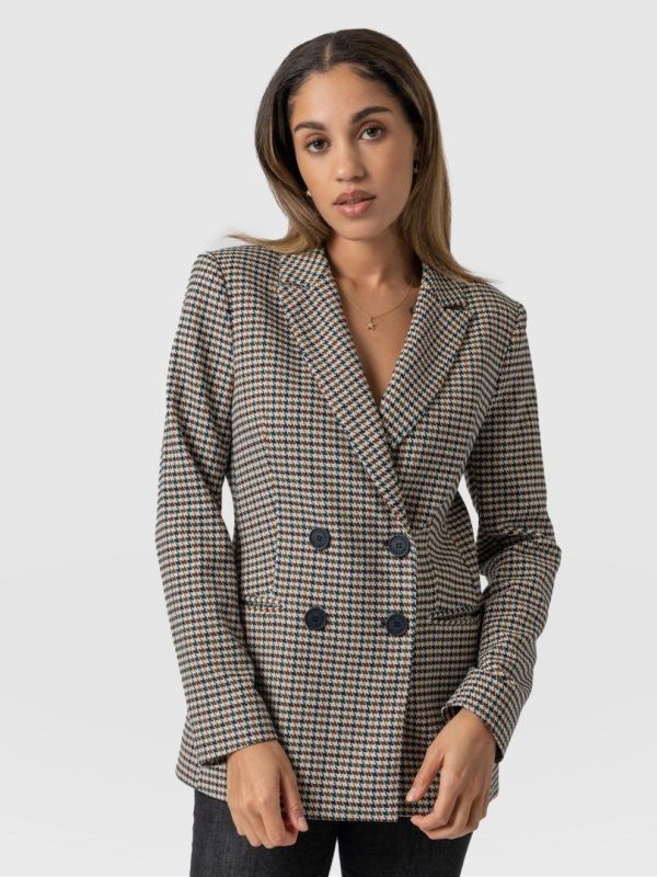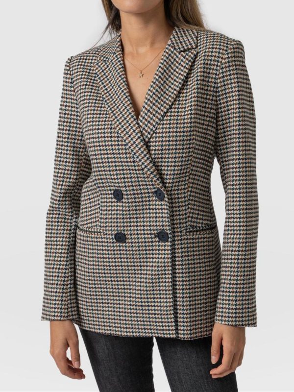 Elevate your wardrobe with the Cambridge Blazer in Saxon Jacquard, a beautifully tailored classic double breasted jacket that will become one of your autumn wardrobe essentials. This blazer features a chic cream and black check design, adding sophistication to any look. Wear it with the matching Carnaby Mini Skirt or Palmer Pant for a coordinated look, or as a stand-alone piece with sneakers and jeans for a more casual vibe.