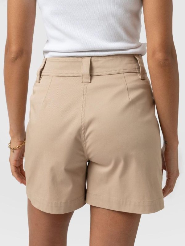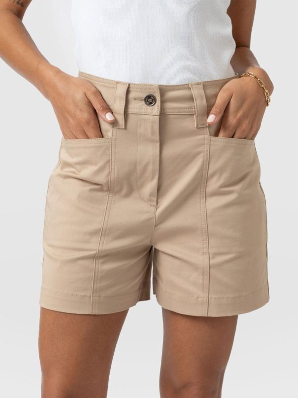 A pair of fitted cargo shorts in beige made from organic cotton and infused with a hint of stretch for all-day comfort. They’re topped by a high-rise waistband and trimmed with tonal stitching for a casual finish. Each pair is handmade by skilled artisans and features large front pockets to store all your daily essentials. Style yours with a white tee and your favourite sandals to create a relaxed seasonal look.