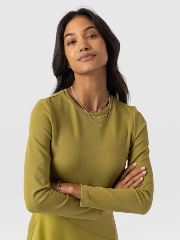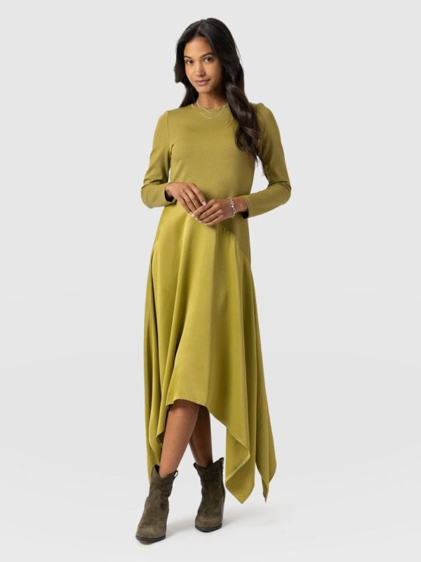 Meet the Cleo Asymmetric Dress in olive, a new long-sleeved design that delivers timeless elegance to your wardrobe. Handmade by our team of skilled artisans, this A-line silhouette is cut from a soft and smooth jersey and features a diagonal waistline that splices down your middle for a touch of interest. Finishing with a midi-length skirt that falls in gentle pleats, it can be paired with chunky boots for an edgy finish.