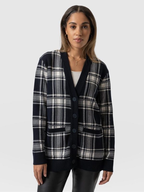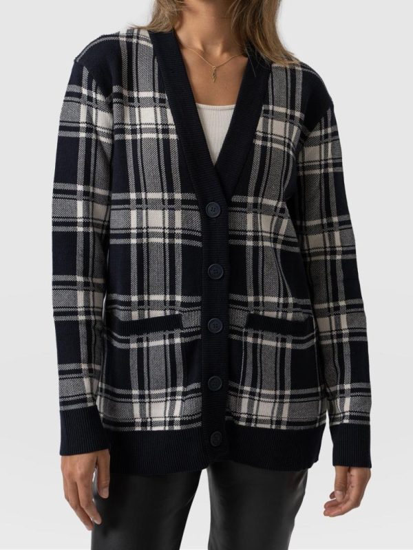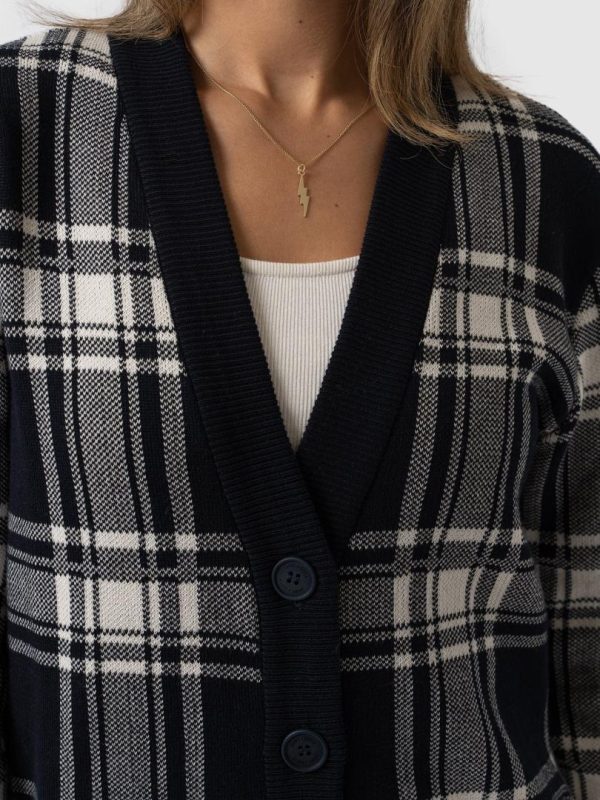 Make: Cotton knitted check cardigan. Oversized fit. Gold buttons. V-neck neckline. Generous pockets.