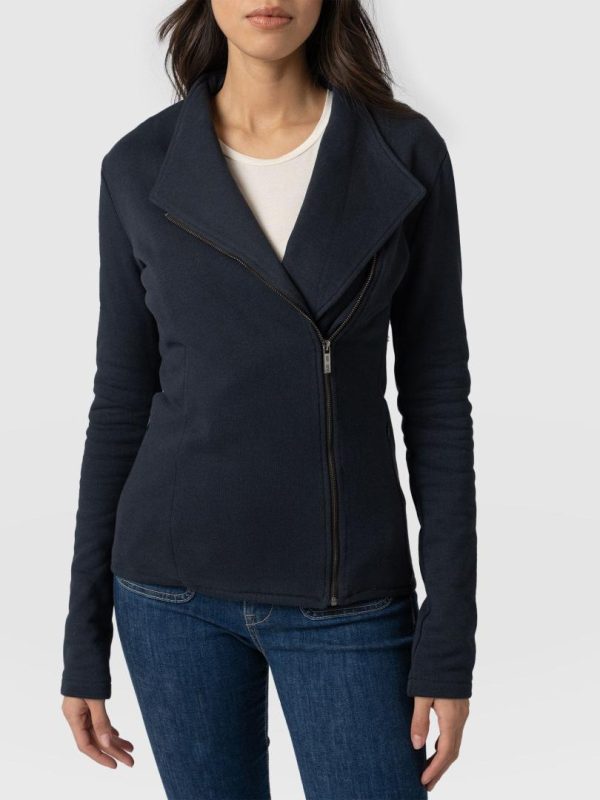 Make: Organic cotton biker jacket. Slim fitting. Perfect blend between a jacket and a cardigan. Brushed fleece internals. Pockets.