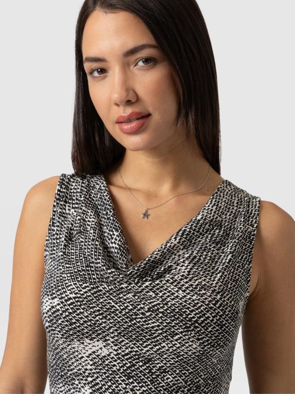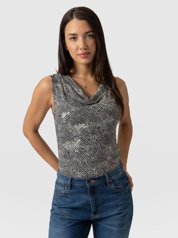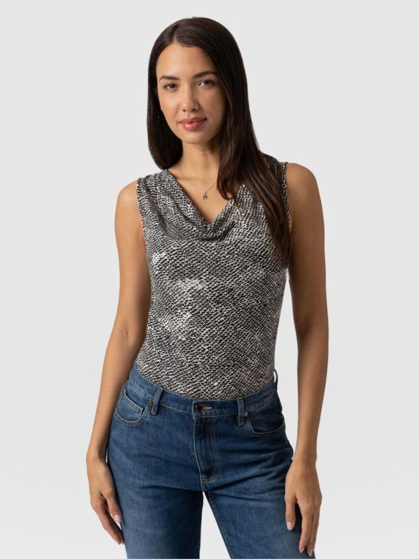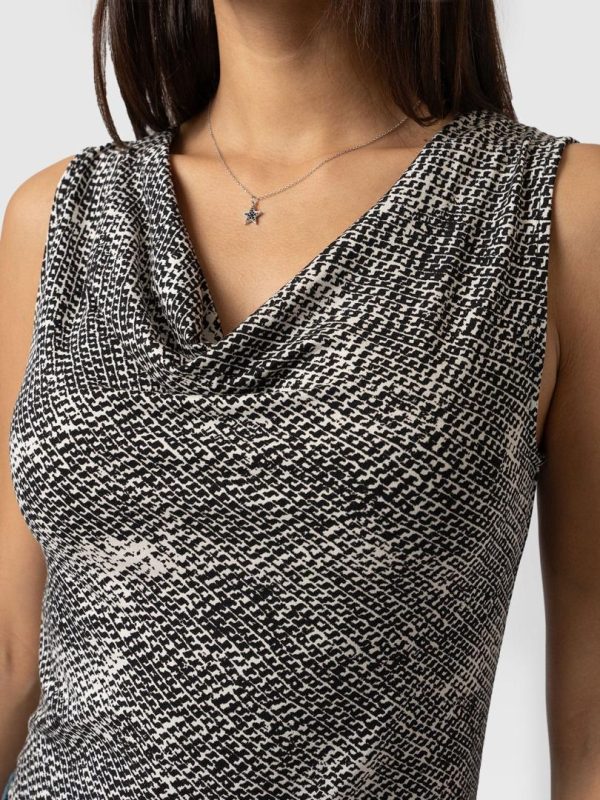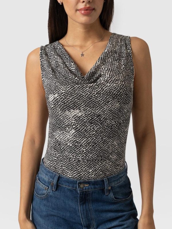 A beautiful cowl neck sleeveless top made from a soft jersey in our Monochrome Gothica print. Perfect for layering, this cami is designed with a flattering neck detail that helps to make a show of your décolletage. Each style is made in our studios in Europe and finished by hand by our skilled artisans – who ensure a quality that will last for years to come. Pair it with jeans or leggings for a casual look or with pants, heels, and a short leather jacket for a work look infused with attitude.