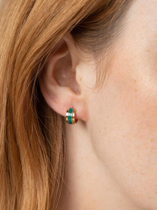 A beautiful set of Enamel Striped Huggie Earrings in gold/green. Perfect for styling with our matching necklace or bracelet or as a gift for loved ones. Each set is handmade to guarantee both precision and a quality that will last. These earrings blend classic charm, featuring green enamel stripes on a chic huggie design. Pair with the matching necklace and bracelet and even the Enamel Hoop earrings.