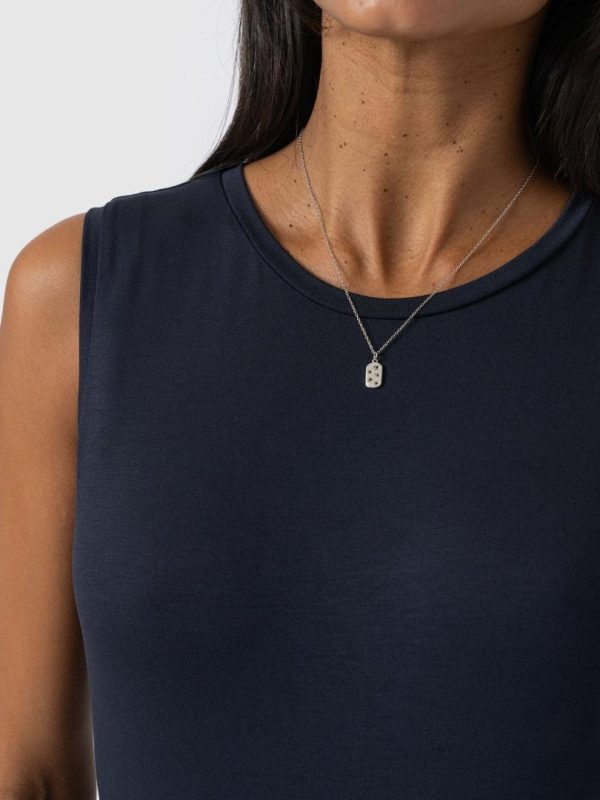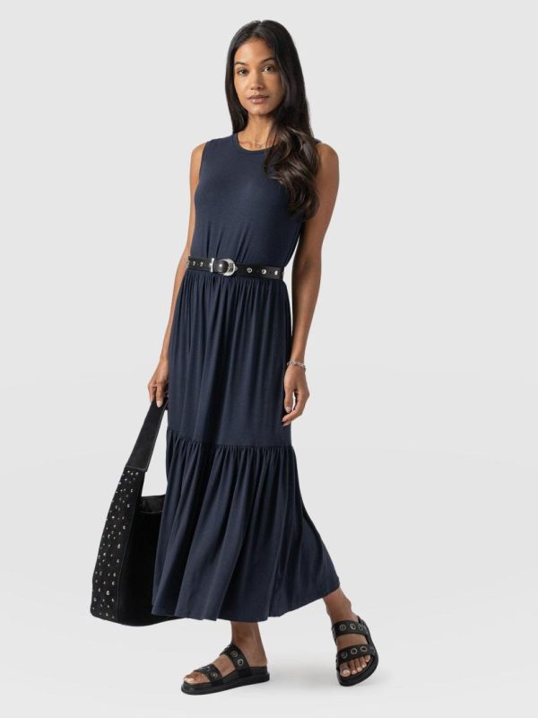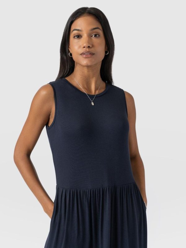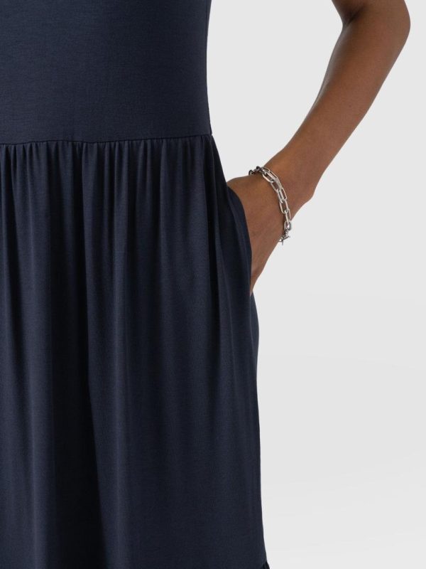 A comfortable, tiered midi dress in navy made with the softest jersey for an easy look and feel for all the seasons. We designed this style with flattering tiers and used a soft and sustainable viscose fabric with a beautiful drape (and a little stretch). It has a soft and silky hand feel and a relaxed fit. Pair easily with sandals in the summer. sneakers or boots in the winter and with heels for a smarter look for work or nights out.