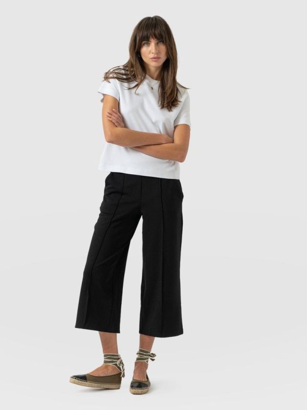 A wide leg culotte pant in black, a unique and stylish piece for your wardrobe. Featuring a pintuck design, these culottes are a shorter version of the Keller Wide Leg Pant, perfect for the warmer months. The pintuck detailing adds a touch of sophistication, making them perfect for a formal occasion or a day out. Pair them with a Rib Cami and Studded Sutton Slides for a chic finish.