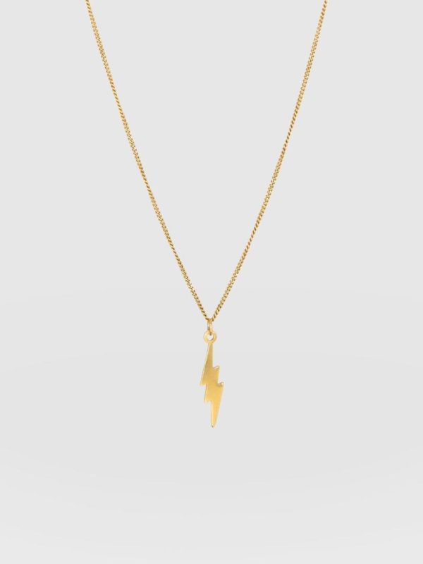 A classic, gold plated necklace adorned with a rock-and-roll lightning bolt. Designed in our London studios and hand made by artisans in Europe, it uses recycled 18-carat gold plating atop sterling silver for a planet-friendly finish. Each necklace is given an individual polish for the highest shine and is designed to pair with our Rock Tee or Lightning Dress for the ultimate punk-enthused outfit. Rock on.