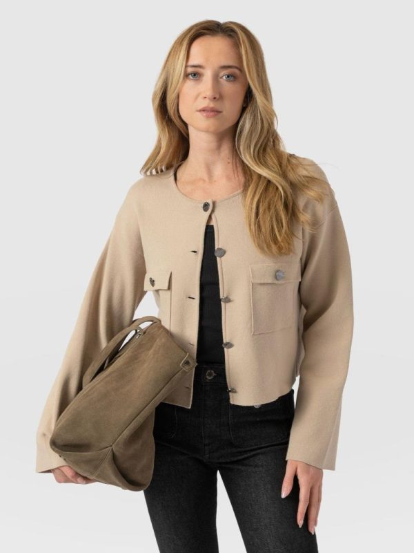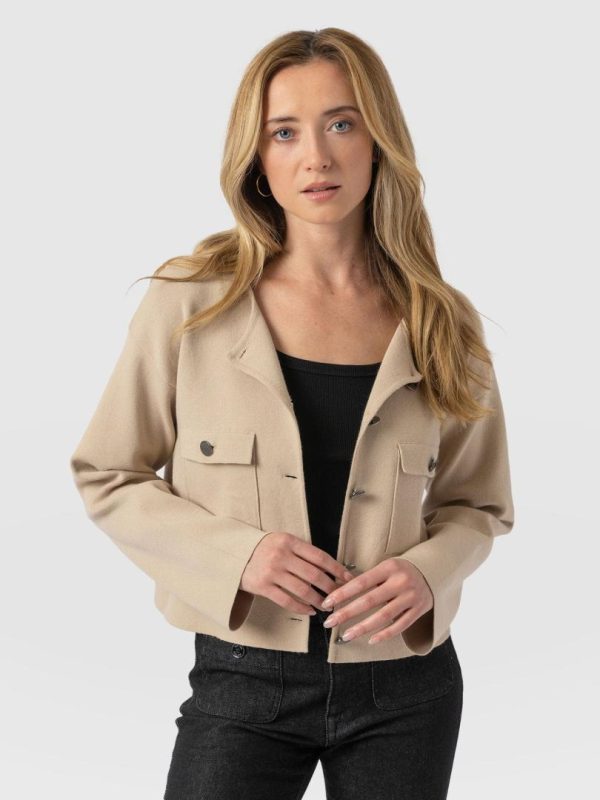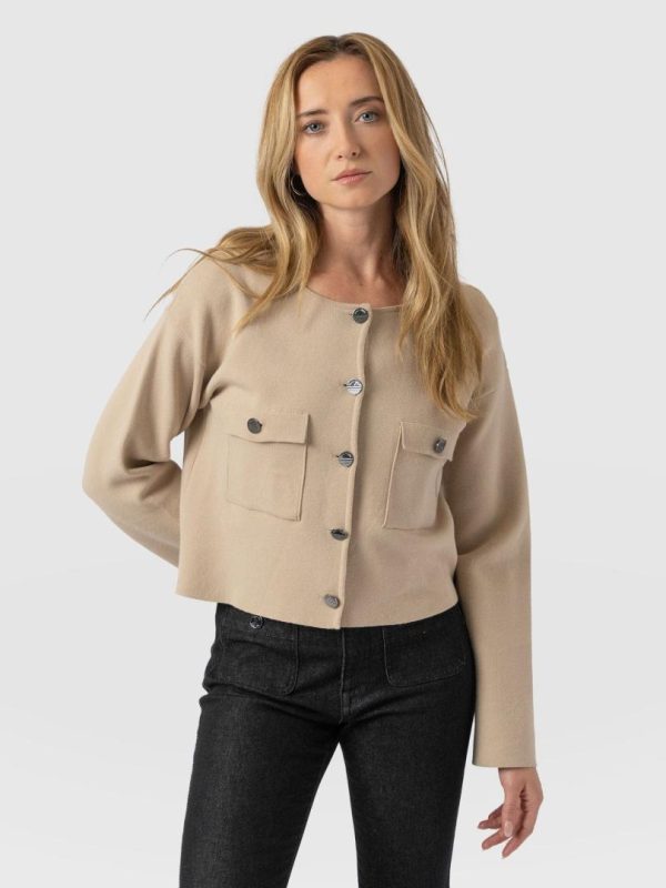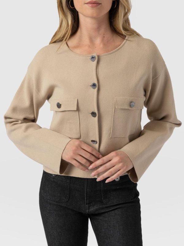 Look: Cropped knitted jacket. Functional check pockets with button attachment. Button up jacket. Turn back cuff detail.