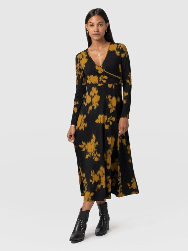 The Maggie Wrap Dress is a beautiful midi cloaked in our floral Yellow Fade Floral print and handmade by artisans in Europe who use a soft and sustainable eco-viscose. This chic style features a skin-baring V-neckline mock wrap and a full A-line skirt. Thanks to its long sleeves, it’s perfect for styling all year round; slip yours on in the summer with sneakers and in the winter with a jacket, tights, and boots.