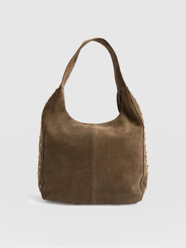 Meet the Margot Hobo Bag in khaki. This contemporary style is made by hand and shaped from pure suede to a chic hobo-style silhouette with a wide shoulder strap. For a touch of edgy elegance, glimmering studs are decorated down the sides to make sure you catch the eye of everyone who passes by. Inside, you’ll find a roomy main compartment and plenty of pockets to store all your essentials.