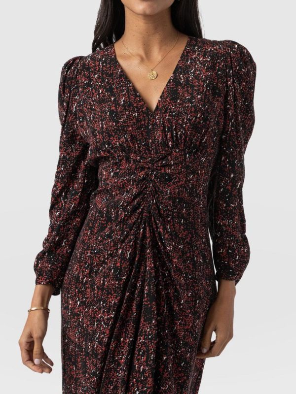 Masterfully designed to sculpt and accentuate your figure, the Paloma Ruched Dress in our new Red Ditsy Leopard print is a beautifully flattering design. It’s handmade from a lightweight eco-viscose and cut to a midi-length silhouette with an asymmetric hemline. The bodice features ruching at the waistline and a plunging V-neckline for an elegant look. And for the perfect finishing touch, slightly puffed long sleeves make this the perfect style to wear year-round.