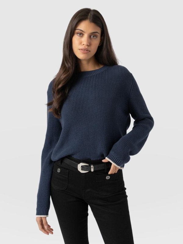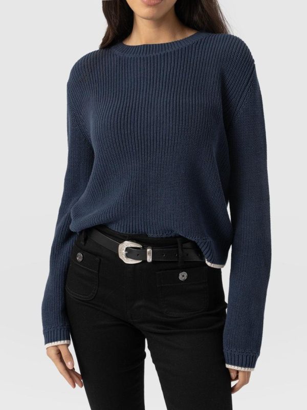 A transitional knit designed for the changing seasons, the Remy Crop Sweater in navy boasts a chunky rib stitch to keep you warm when the weather shifts to cooler temperatures. Its regular-fitting silhouette and crew neckline are handmade using soft and smooth organic cotton and trimmed with contrasting tipping along the cuff and hem for an elegant finish. Dress down with high-waisted jeans and sneakers, or style up with the Bonham Leather Shorts and boots.